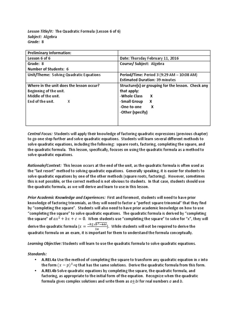 Observation 1 Lesson Quadratic Formula Quadratic Equation Factorization